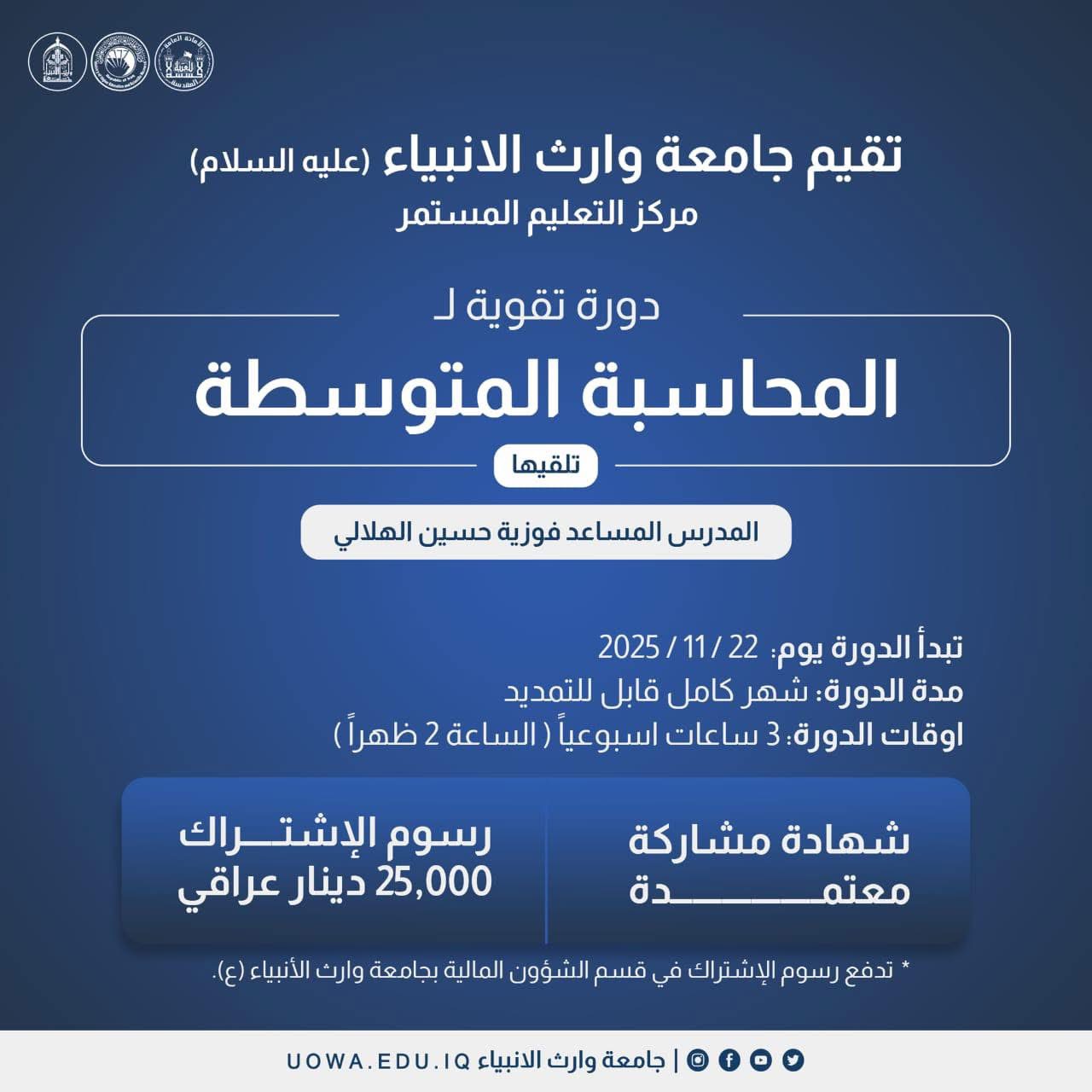 يسر مركز التعليم المستمر في جامعة وارث الأنبياء (عليه السلام) الإعلان عن استمرار التسجيل على دورة تقوية للمحاسبة المتوسطة ، التي ستبدأ من 22/11/2025📅، يقدمها المدرس المساعد فوزية حسين الهلالي.