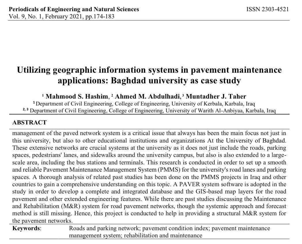 حيث تناول البحث حالة دراسية عن استخدام نظم المعلومات الجغرافية في تطبيقات صيانة الرصف: جامعة بغداد انموذجاً.