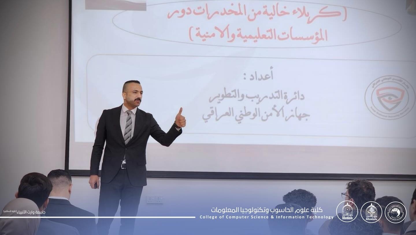 «كربلاء خالية من المخدرات – دور المؤسسات الأمنية»، استهدفت طلبة المرحلة الأولى في أقسام تكنولوجيا المعلومات، الأمن السيبراني، والذكاء الاصطناعي.