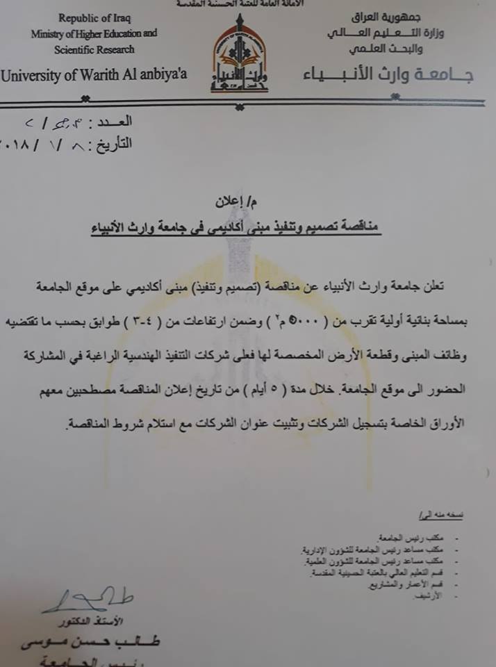 مساهمة من جامعة وارث الانبياء لبناء وتنمية القيادات الحكومية يعلن قسم التعليم المستمر اقامة دورة تدريبية بعنوان (الفساد الاداري التشخيص والعلاجات) لقيادات الدوائر الحكومية والقطاع الخاص والوسائل الاعلامية والقيادات الجامعية يلقيها ا.د.عاصم محمد الاعرجي ولمدة ثلاثة ايام بواقع اربعة ساعات لليوم الواحد وباجور اشتراك ١٥٠٠٠٠ دينار علما :ان فترة التسجيل يبدأ من يوم الثلاثاء الموافق ٢/١/٢٠١٨ ولغاية اسبوع في مقر الجامعة بمليء استمارةالمستمسكات المطلوبة جنسية اوبطاقة وطنية مع صورة عدد ٢صك او مبلغ الاشتراك تأييد من دائرة المشترك
