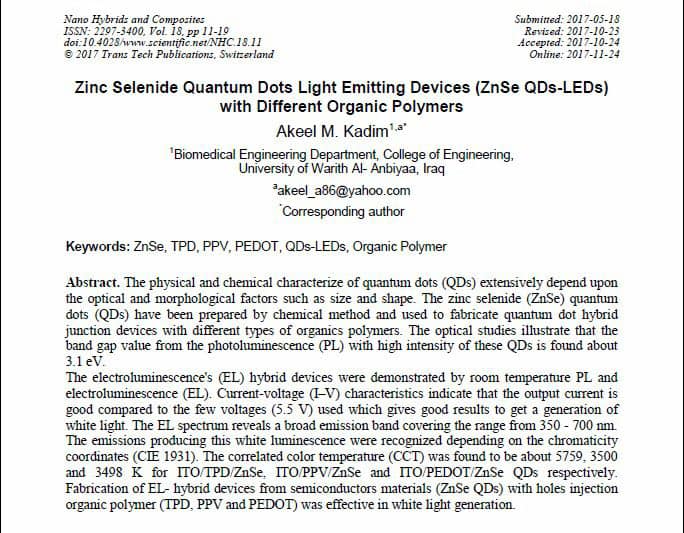 وحسب ما تحدث به الباحث بان البحثيين اختصا في تصميم الاجهزة الباعثة للضوء من مواد نانوية ومركبات عضوية من بوليمرات مختلفة التركيب تسمى ((OLEDs)) والتي تتشكل هندسياً بطريقة كيميائية معينة وتبعث ضوءً ذو ضيائية عالية وبكفاءة ممتازة وبفولتية كهربائية قليلة قد تصل الى (11فولت) واوضح الدكتور عقيل بان اهم التطبيقات لهذا الانجاز العلمي في الحياة العملية هو دخوله في مجال الهندسة الطبية الحيوية حيث يكون عمل هذه الاجهزة ككواشف ملونة بألوان الضوء الباعث منها لكشف الامراض والاورام داخل جسم الكائن الحي وفي العديد من المجالات الهندسية والطبية والابحاث العلمية الاخرى.