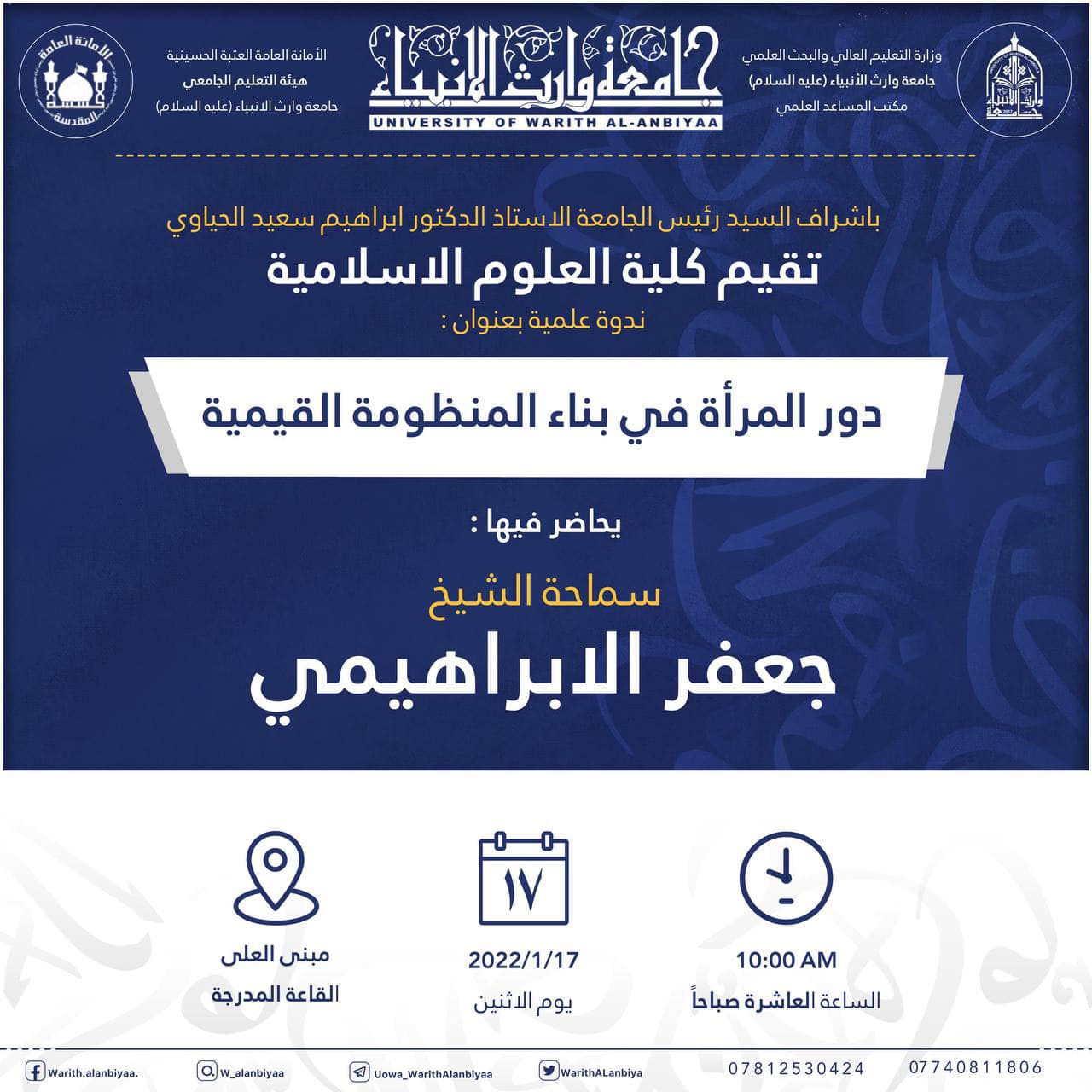 تحت اشراف رئاسة جامعة وارث الانبياء (عليه السلام) تقيم كلية العلوم الاسلامية ندوة علمية بعنوان (دور المرأة في بناء المنظومة القيمية)  يحاضر فيها سماحة الشيخ جعفر الابراهيمي وذلك في تمام العاشرة من صباح يوم الاثنين الموافق 17-1-2022 ، على القاعة المدرجة في بناية العلى.