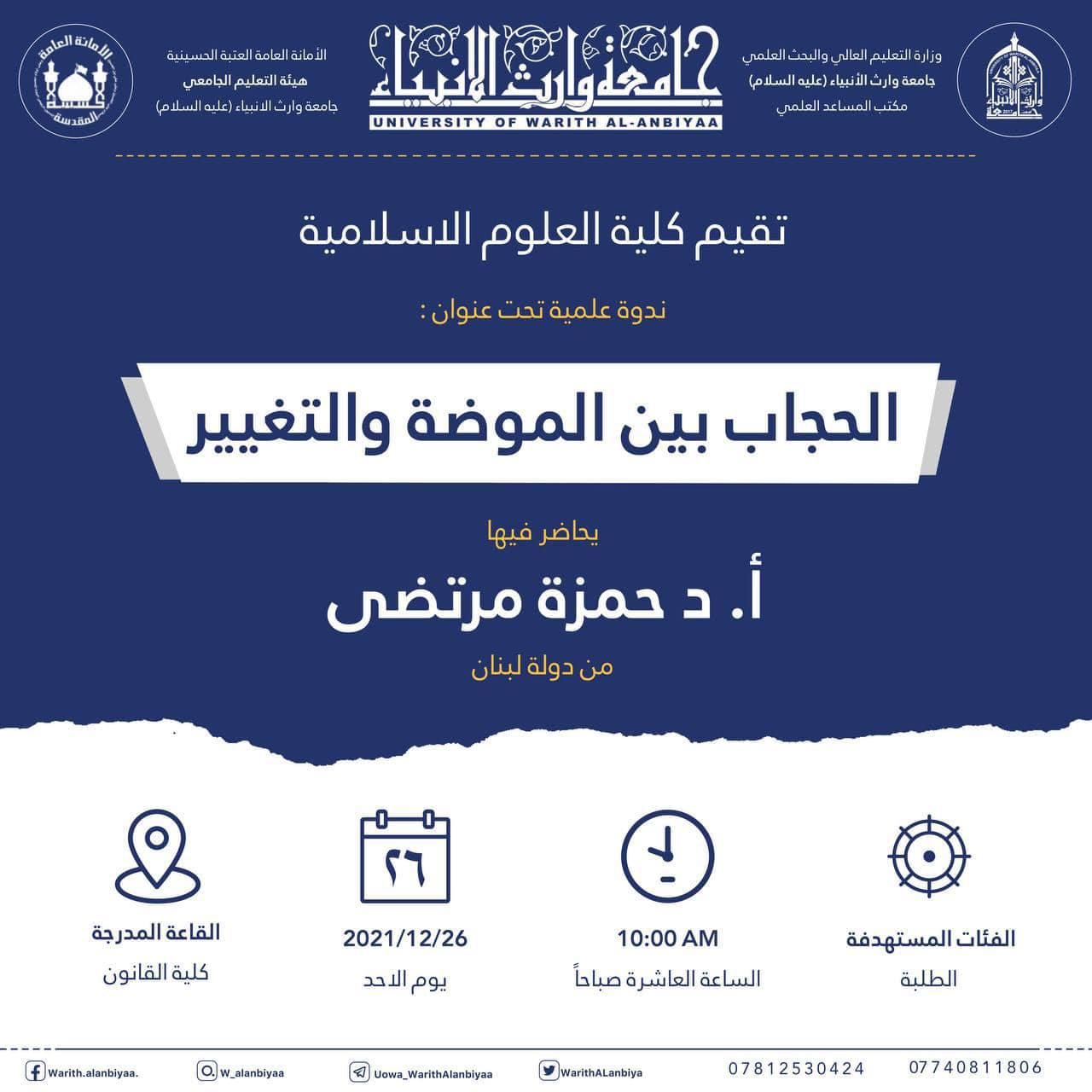 برعاية السيد رئيس جامعة وارث الأنبياء(عليه السلام)، عقدت كلية العلوم الاسلامية وبالتعاون مع قسم تطوير الموارد البشرية في العتبة الحسينية المقدسة ندوة ثقافية أخلاقية بعنوان: (الحجاب بين الموضة والتغير).وبين المحاضر الأستاذ الدكتور حمزة مرتضى من دولة لبنان "مفهوم الحجاب وأدلة وجوبه وأنواعه" مفرّقاَ بين ما هو منسجم مع تعاليم الشريعة وما هو خارج عنها.وأكد أن "الستر والعفاف هما تاج المرأة المسلمة التي ميزها الله تعالى عن غيرها" معللا ذلك بأن "الاسلام كرم المرأة غاية الكرم وبالغ في حمايتها وصونها".وحذر المحاضر جميع الطالبات العزيزات من مغبة "الانجرار خلف من يحاول ان يشوه صورة الحجاب ويدعو الى عدم الالتزام به بعبارات يراد بها الباطل، وبحجة الموضة والتطور والاعاقة في العمل أو غيرها".وختم محاضرته قائلا: "فكما للطبيبة زي خاص فان للمراة المسلمة زيها الخاص الذي يحفظها ويصونها".