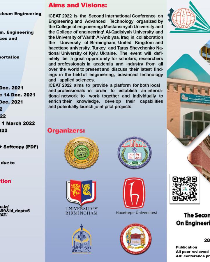 حرصاً على ديمومة التعاون العلمي بين مؤسسات التعليم العالي في العراق ولما تمتلكه الجامعة من قامات علمية وأكاديمية،انضمت جامعة وارث الانبياء(عليه السلام) الى الهيئة التنظيمية للمؤتمر الدولي الثاني للهندسة والتقنيات المتقدمة(ICEAT-2022) ،الذي ستقيمه كلية الهندسة بجامعة القادسية ،وبمشاركة كلية الهندسة بالجامعة المسنتصرية ،إضافة الى جامعات دولية اخرى (جامعة حجة تبه التركية و جامعة برمنكهام البريطانية وجامعة كييف الوطنية) ،حيث سيعقد المؤتمر افتراضياً بسبب ضروف الجائحة في العاصمة التركية إسطنبول بتاريخ ٢٨ -٢٩ / ٣/ ٢٠٢٢وسيتم نشر كافة البحوث في مجلة AIP المفهرسة ضمن مستوعبات سكوبس.بإمكان السادة الباحثين المشاركة بالمؤتمر ببحوثهم العلمية القيمة عبر الروابط الآتية:رابط المؤتمر‏https://uomustansiriyah.edu.iq/web_page.php?page_id=2899...رابط قناة التلكرام للاجابة على استفسارات الباحثين الاعزاء‏https://t.me/+aEWuEsX8uk8zZjAyرابط المشاركة كمقيم في المؤتمر‏https://surveyheart.com/for