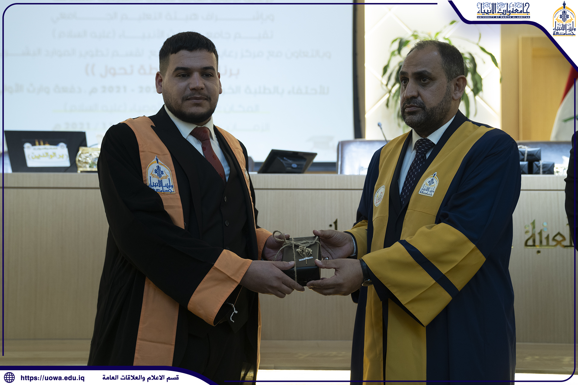 برعاية الامانة العامة للعتبة الحسينية المقدسة نظمت جامعة وارث الانبياء(عليه السلام)وبالتعاون مع مركز رعاية الشباب حفل تخرج مركزي للدفعة الأولى من طلبتها الاعزاء والتي حملت عنوان (دفعة وارث الاولى) .وجرى الحفل البهيج في قاعة سيد الأوصياء بالصحن الحسيني الشريف، بحضور السيد رئيس الجامعة الاستاذ الدكتور طالب حسن موسى والسادة مساعدي رئيس الجامعة والسادة عمداء الكليات واعضاء هيئة التدريس واولياء امور الطلبة .وتضمن الحفل فقرات متنوعة استهلت بتلاوة آيات مباركات من القرآن الكريم، وكلمات لرئاسة الجامعة ، ومن ثم قدمت رئاسة الجامعة لخريجيها الاوائل هدايا مادية ومعنوية وللخريجين بطاقات تهنئة وسط أجواء من الفرح الغامر وبعد ذلك توجه الطلبة لأداء قسم التخرج أمام ضريح سيد الشهداء الحسين(عليه السلام) بامتثال الواجب الوطني والإنساني على أتم وجه بنشر العلم والمعرفة والاخلاص والالتزام باخلاقيات العمل وحمل رسالة العتبة الحسينية المقدسة في جعل خريجيها متميزين على كافة الصعد ومثالا يحتذى به.