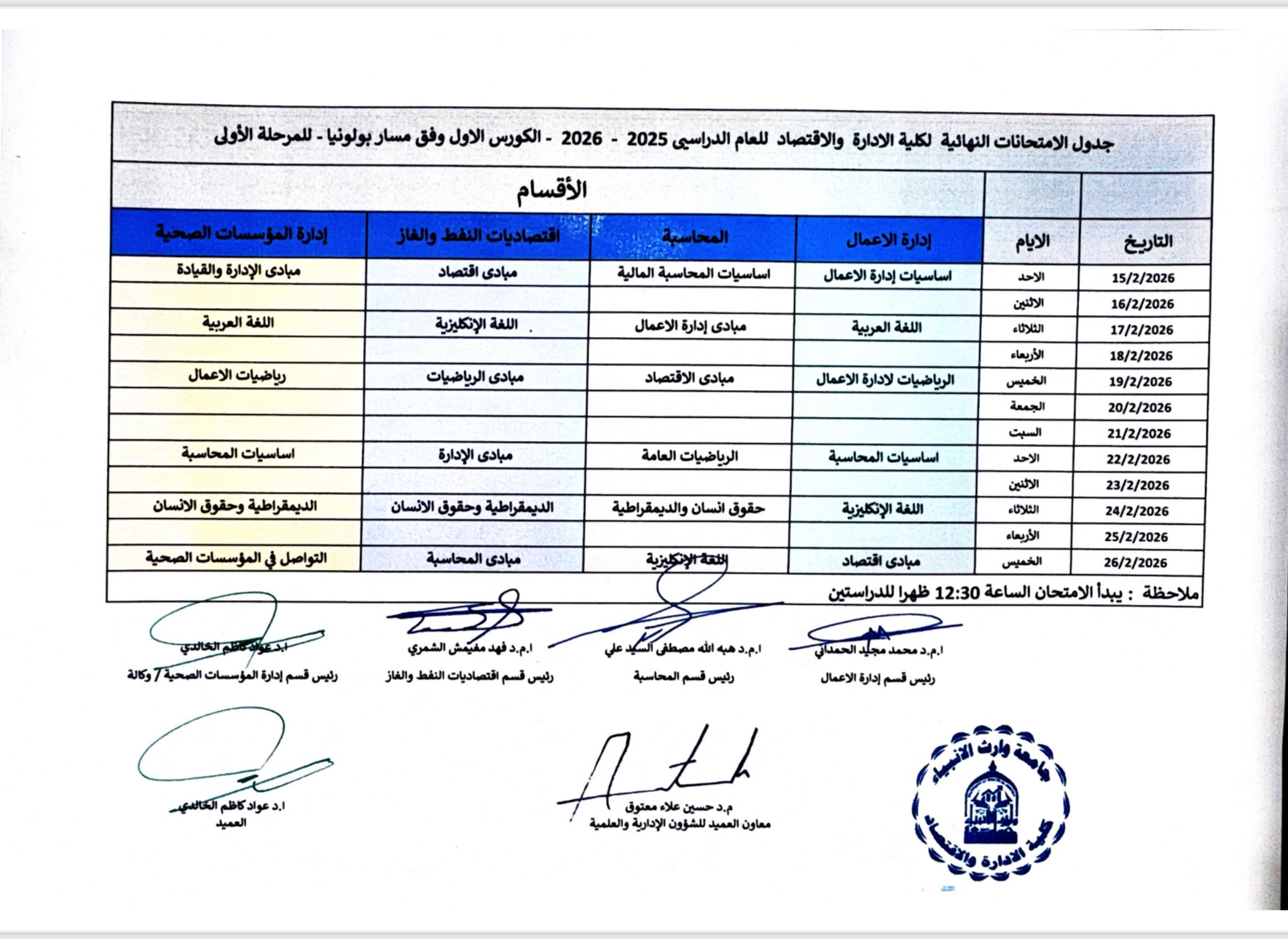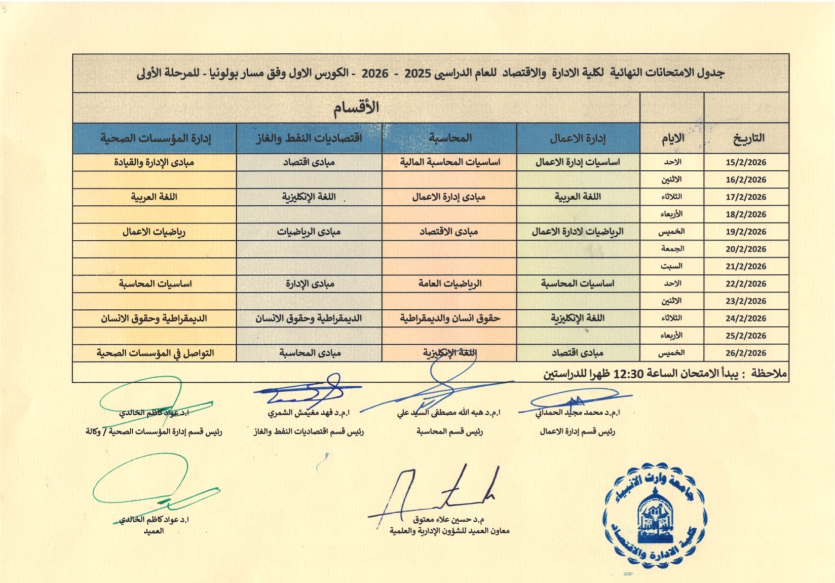 نرفق أليكم جداول الامتحانات الحضورية لجميع الأقسام العلمية