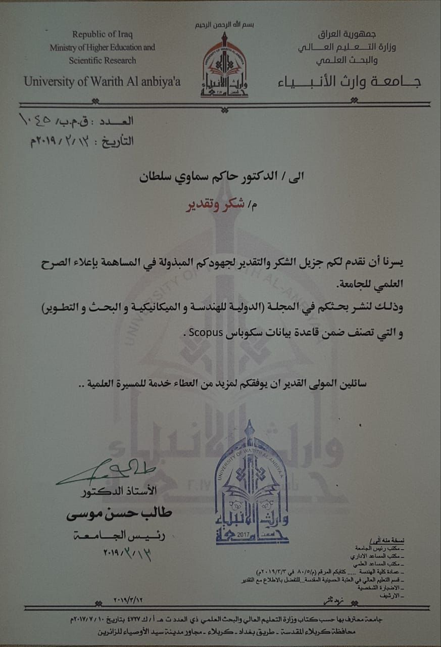 بأسمى الكلمات واطيب والتعابير تبارك رئاسة جامعة وارث الانبياء الاستاذ المساعد الدكتور حاكم سماوي سلطان وهو علم من أعلام الجامعة وعماد من أعمدتها الرصينه على نشر بحثة الموسوم .......... في مجلة سكوباس العالمية لذا لايسعنا الا ان نقدم كتاب الشكر هذا تقديرا لجهوده الجبارة في دعم المسيرة العلمية للجامعة ومن لله التوفيق