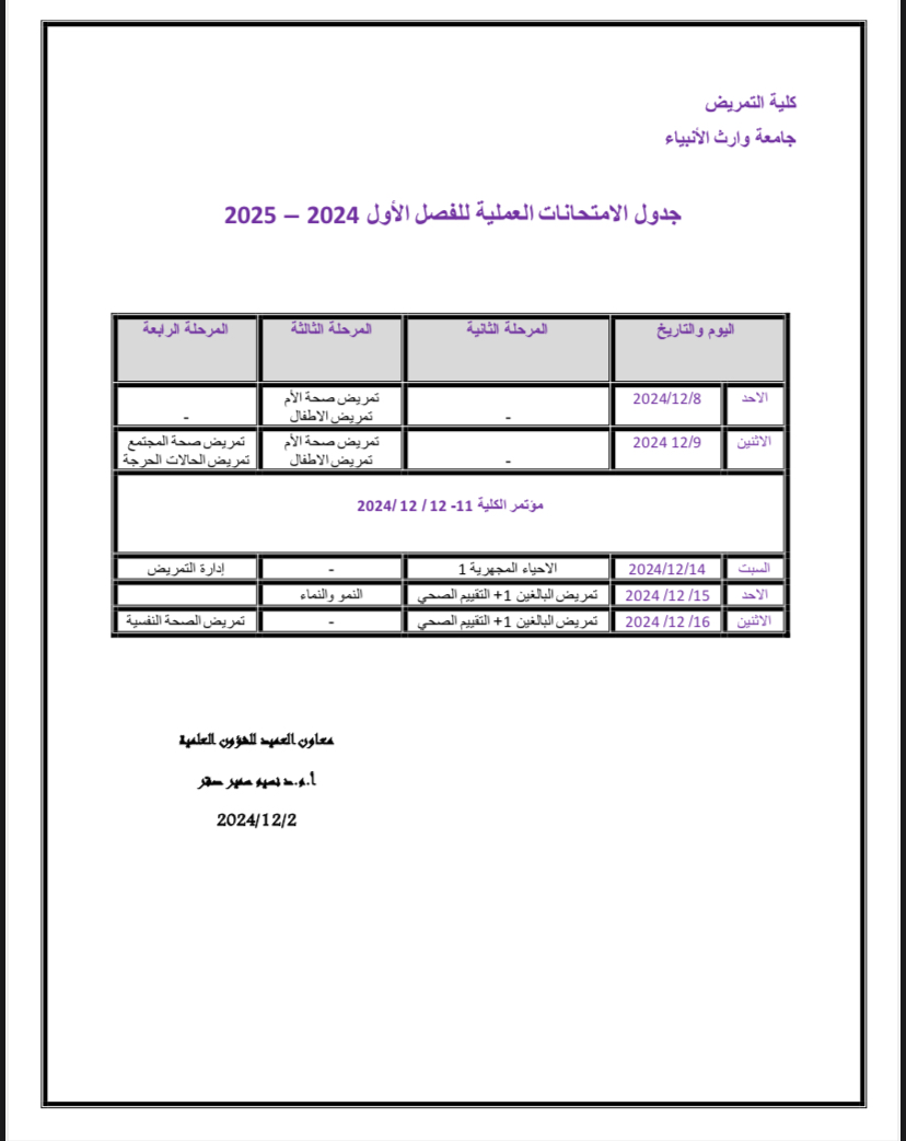 تأجيل امتحان مادة التقييم الصحي ليوم الخميس ٢٦. ١٢ بدل الاربعاء ٢٥ ١٢ س ٩ صباحا