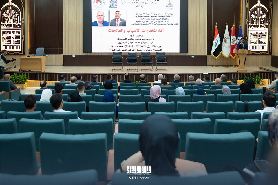 The College of Medicine at the University of Warith Al-Anbiyaa (PBUH) held a scientific seminar titled "The Plague of Drugs: Causes and Solutions," presented by Dr. Jassim Al-Mousawi and Dr. Sabah Al-Jubouri. The seminar explored the reasons behind youth drug abuse, including social and economic pressures and environmental influences. It also discussed possible solutions to curb the spread of this issue through prevention programmes and specialised treatment.