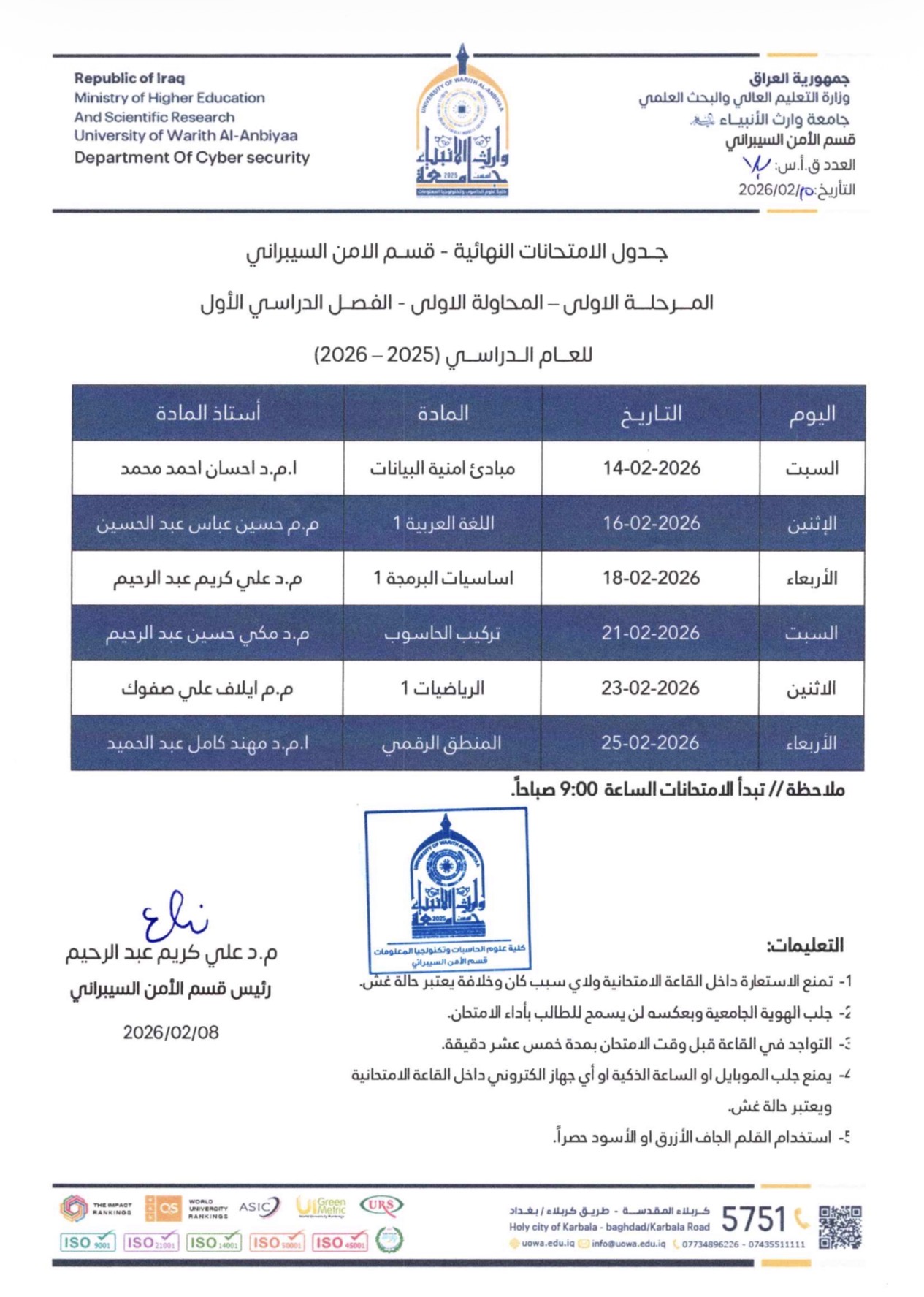 Students of the College of Computer Science and Information Technology, including the Departments of Cybersecurity, Artificial Intelligence, and Information Technology, sat for the midterm examinations of the first semester for the academic year 2025–2026.