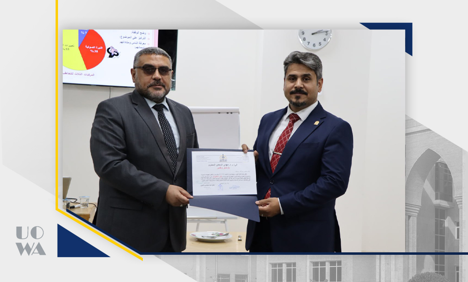 This achievement was supervised by the Student Activities Department. The team was represented in receiving the award by the student Abbas Alaa Dhiaa Al-Din from the College of Science/Department of Information Technology. This was accomplished in collaboration with the University Scout Committee at the Ministry of Higher Education and with the support of the Iraqi Scout Association, through their pioneering project, the "Iraq Scout Application."