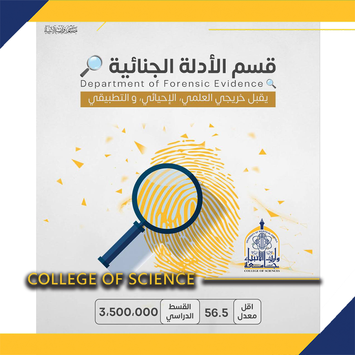 Learn about the admission requirements and the required grades at the College of Science (#Department_of_Forensic_Evidence) at University of Warith Al-Anbiyaa (peace be upon him), and begin your academic journey toward creativity and excellence.