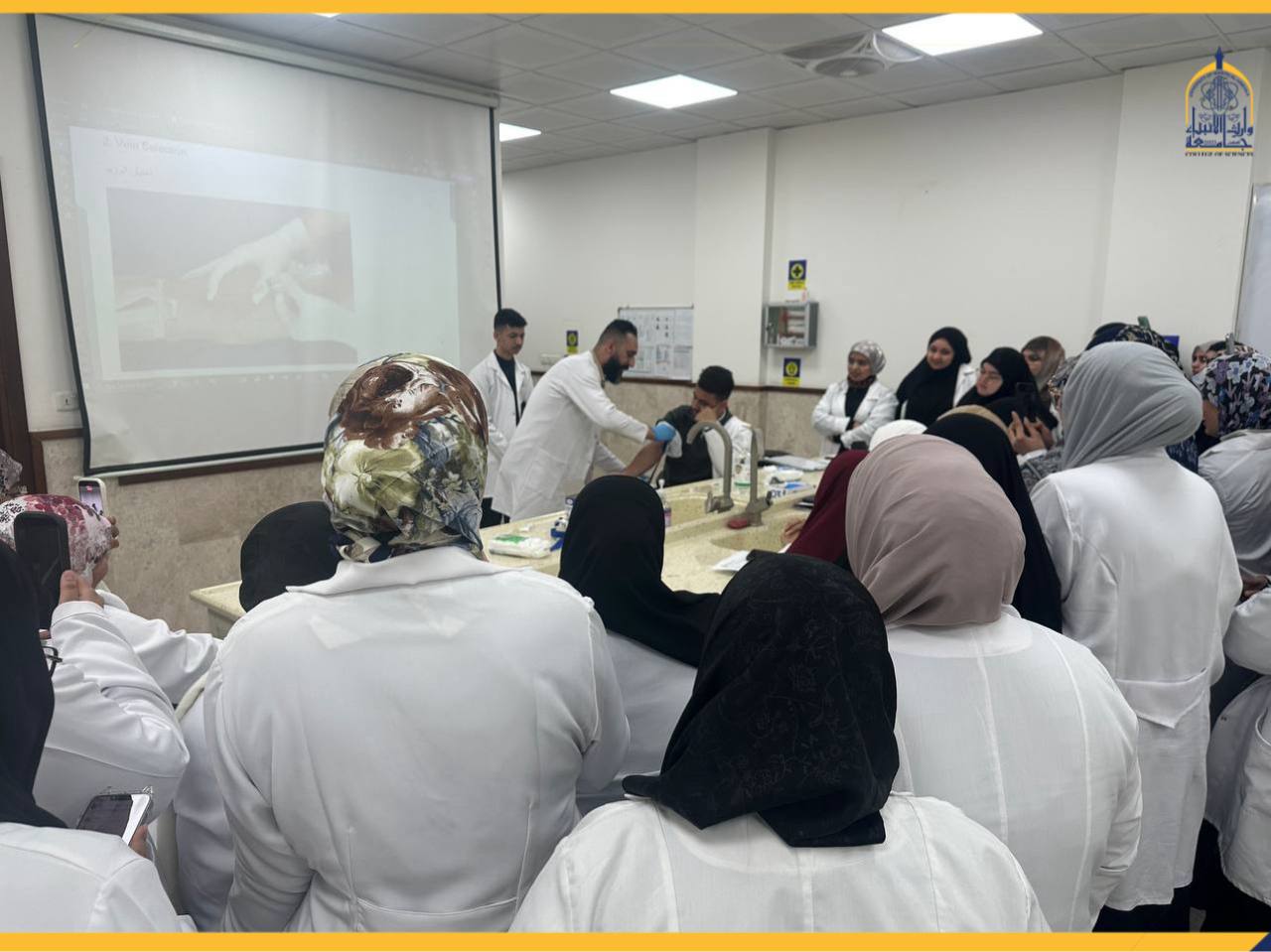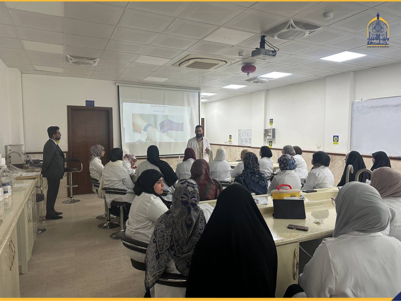 As part of its ongoing efforts to develop students’ practical skills and link theoretical knowledge with real-world application, the College of Science at Warith Al-Anbiyaa University (peace be upon him) held a training workshop entitled “Blood Sampling Skills: Fundamentals and Applications.”